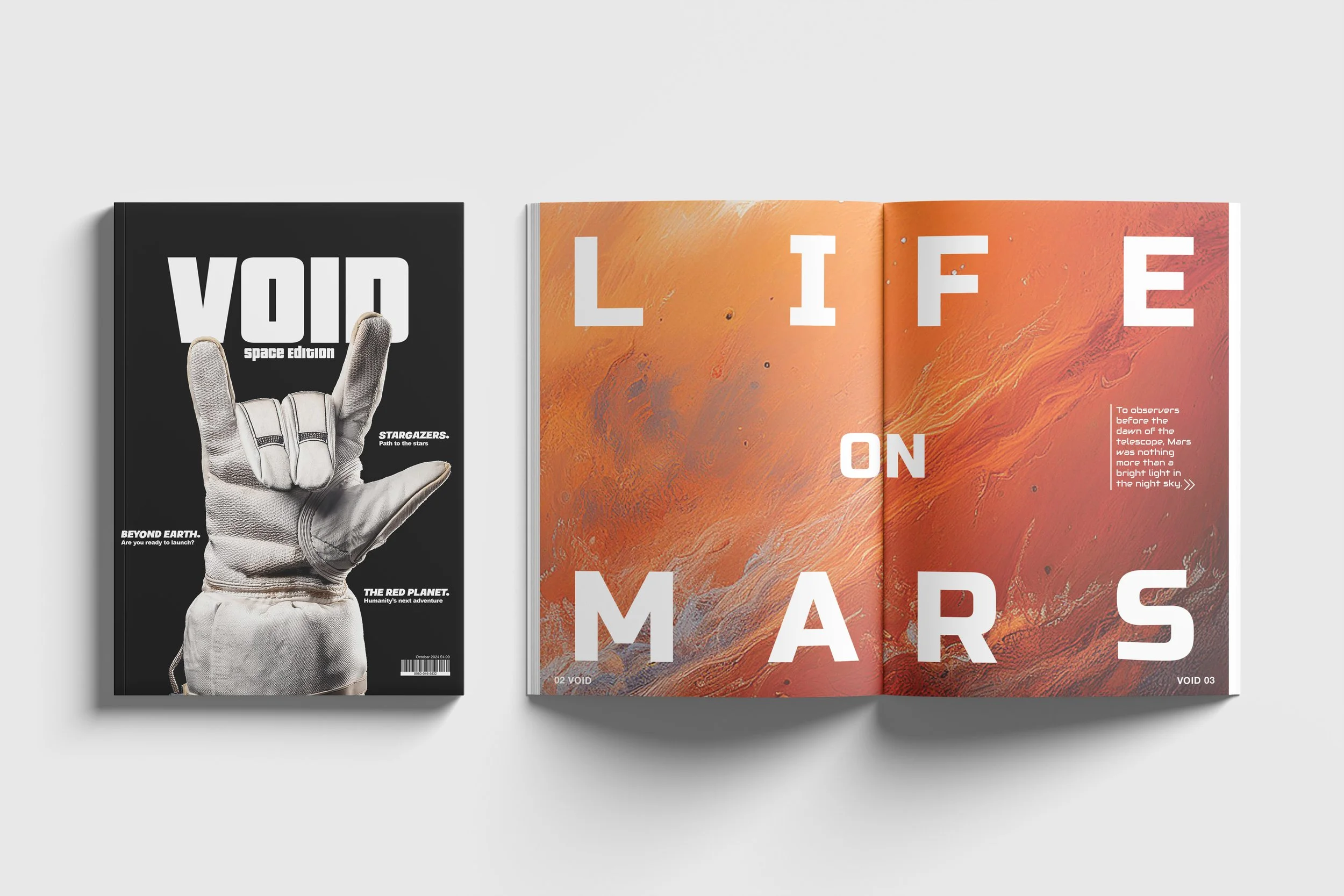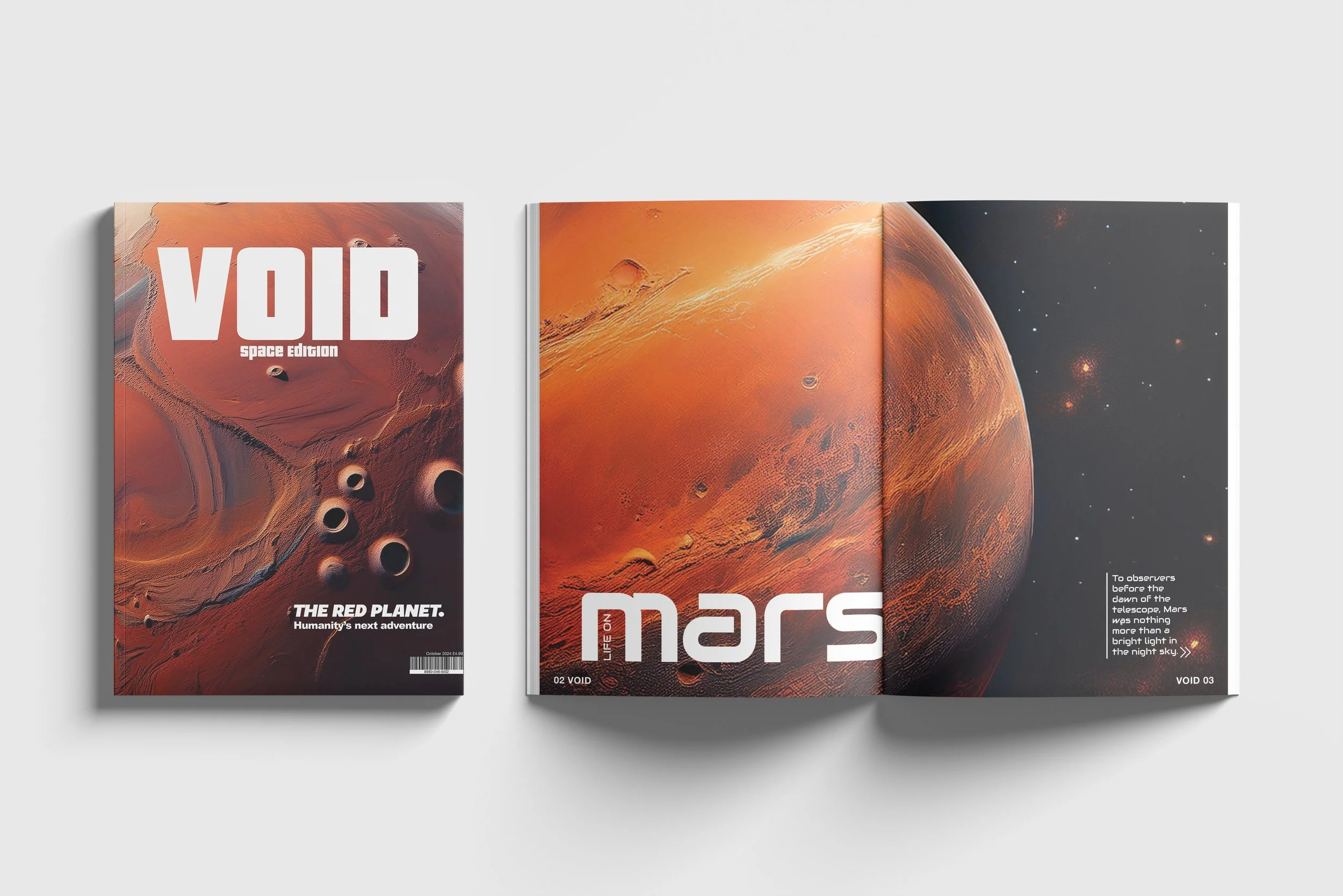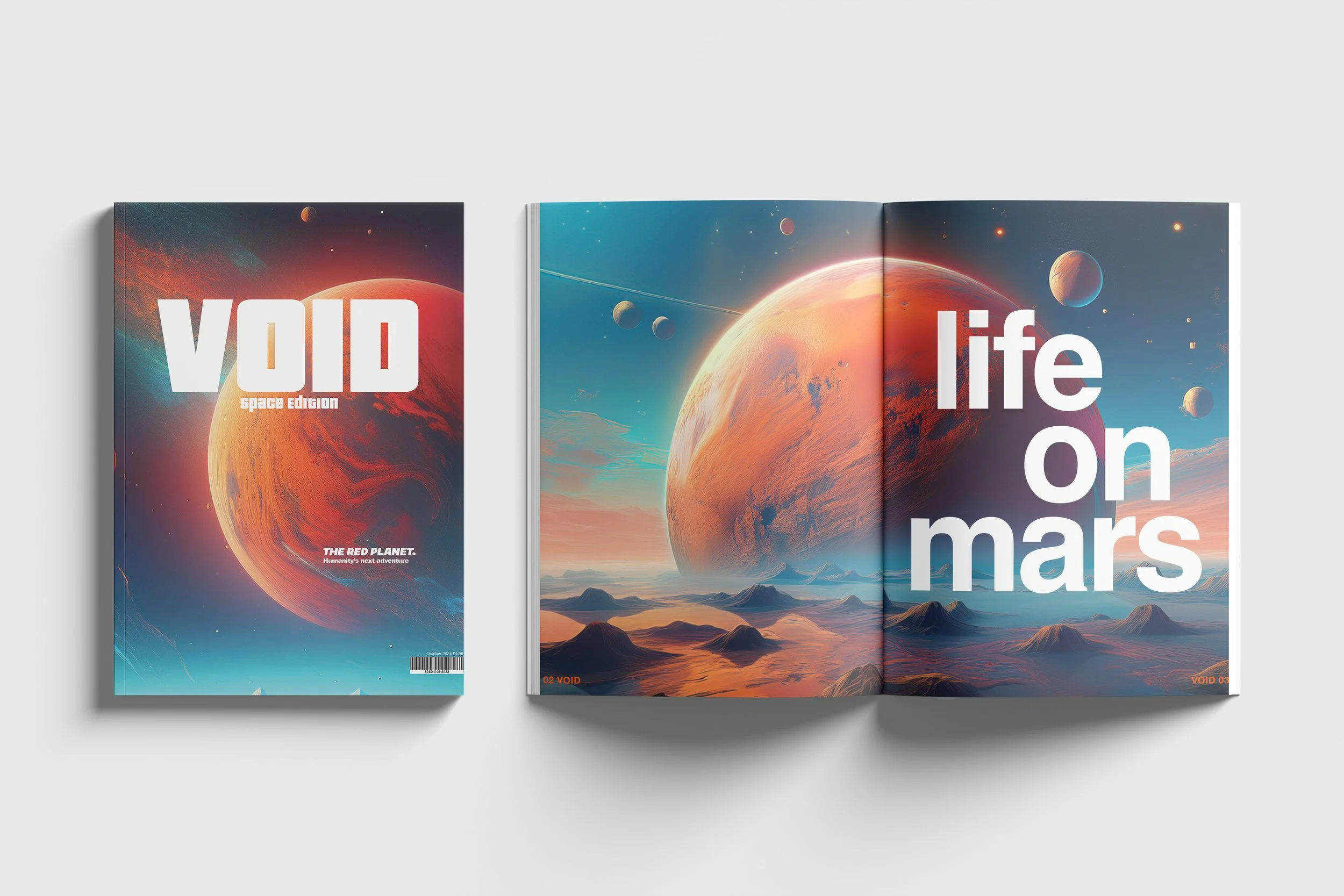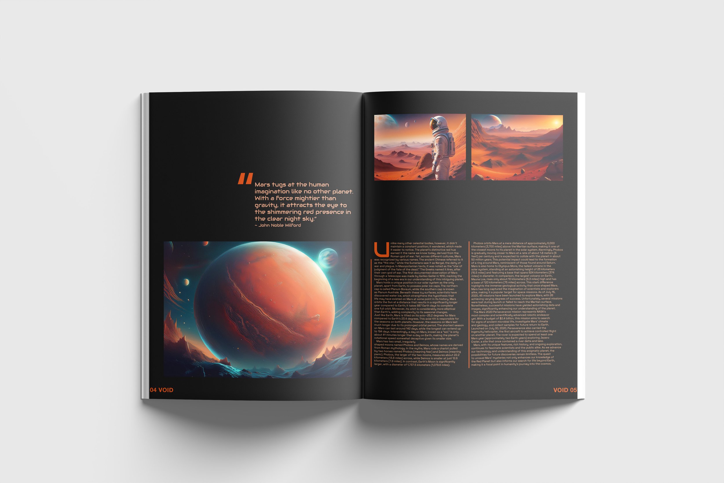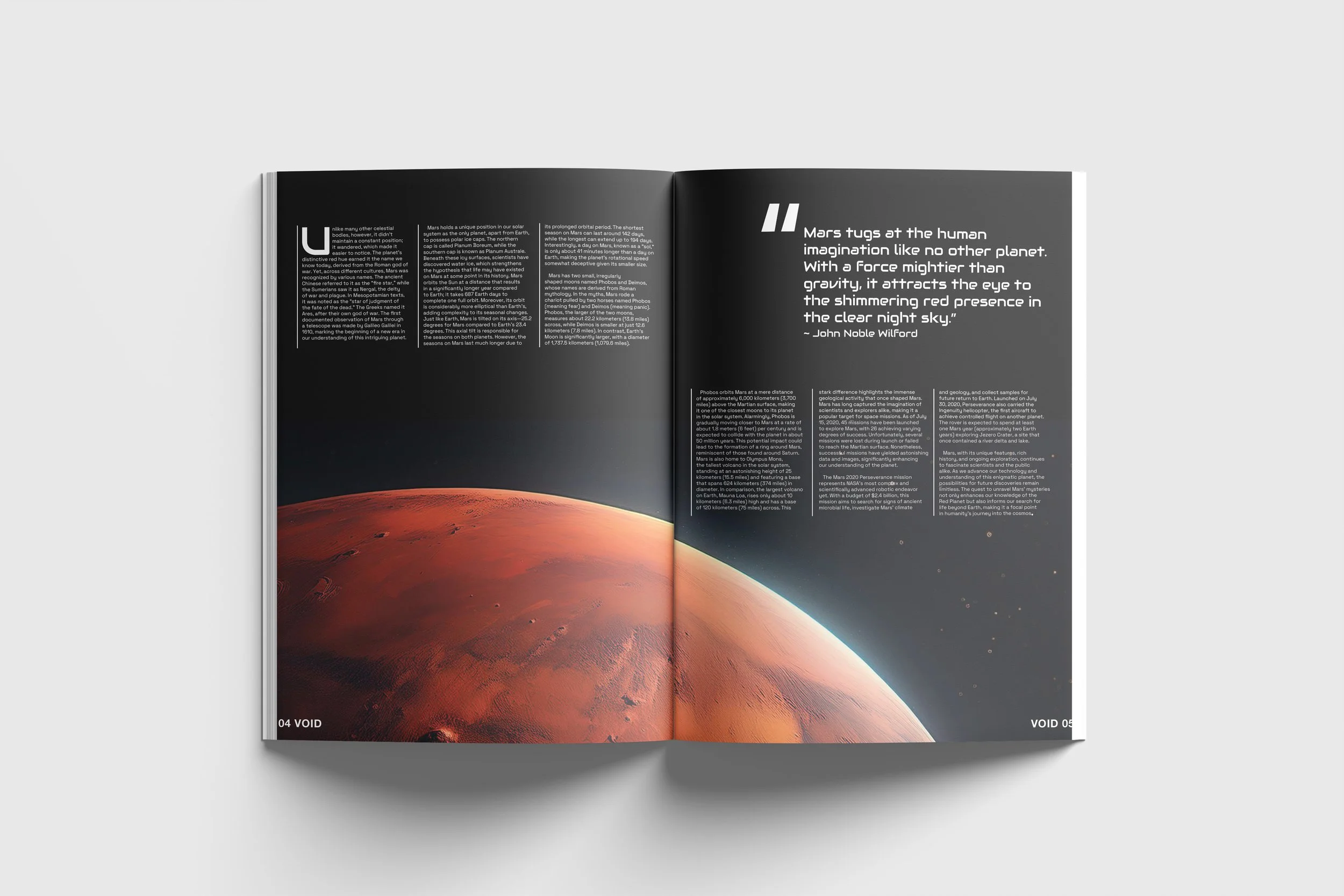 An editorial page for “Life on Mars” that explores the principles of contrast and negative space to evoke curiosity from the reader.